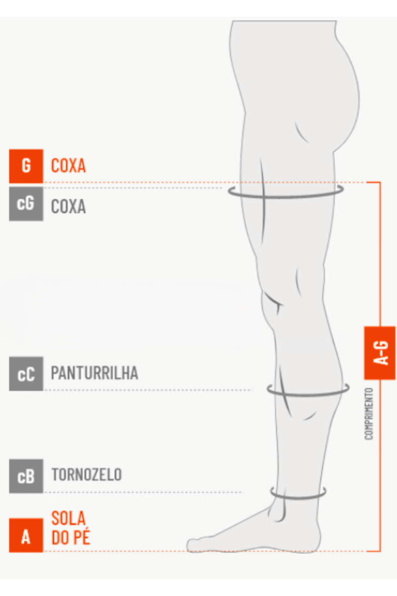 | Tamanho (cm) | Tornozelo (B) | Panturrilha (C) | Coxa (G) |