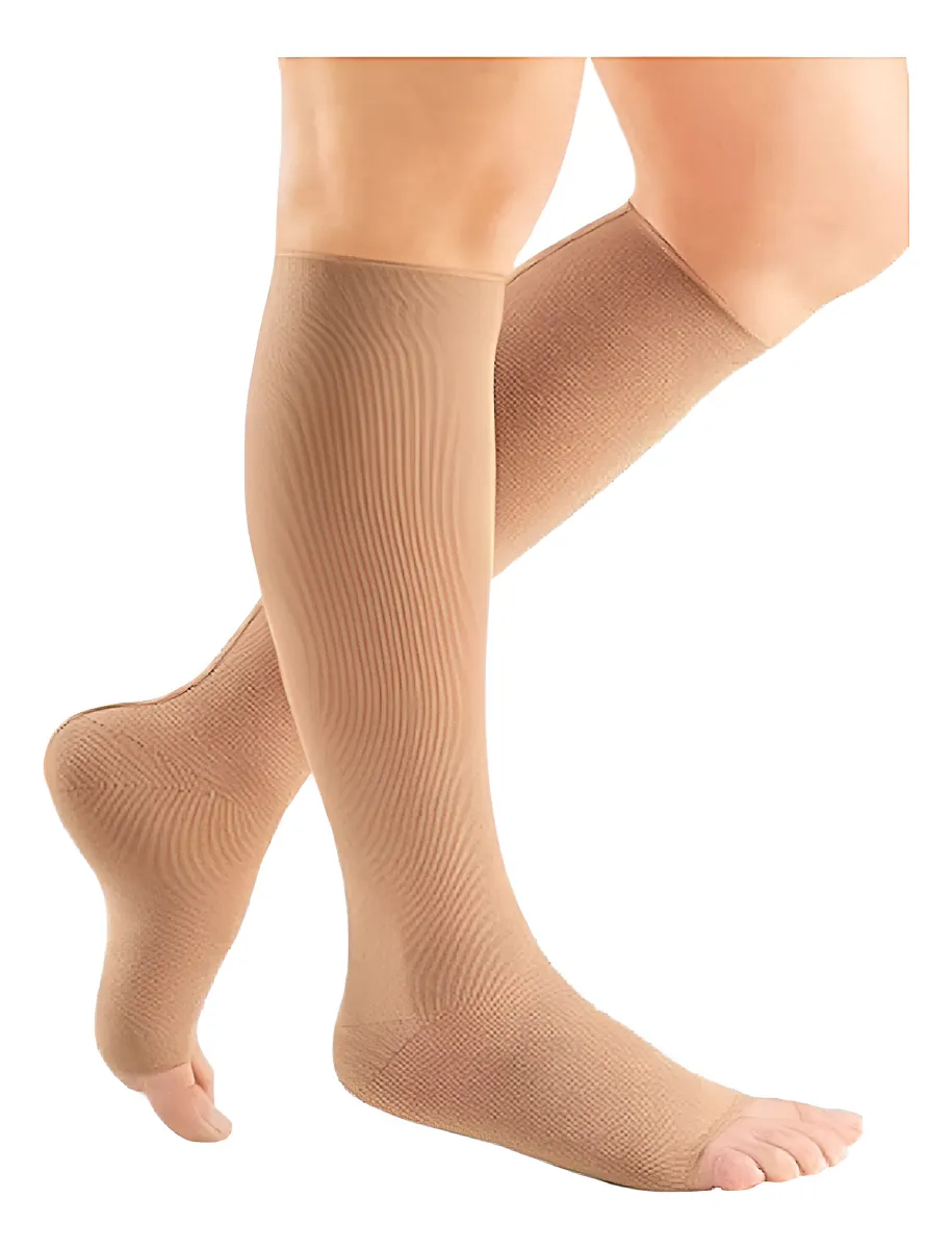 A meias da linha mediven mondi são confeccionadas com malha plana (flat-knit) — caracterizada por um tecido mais denso e menos elástico que malhas circulares, garantindo uma compressão mais uniforme e controlada quando feita sob medida.