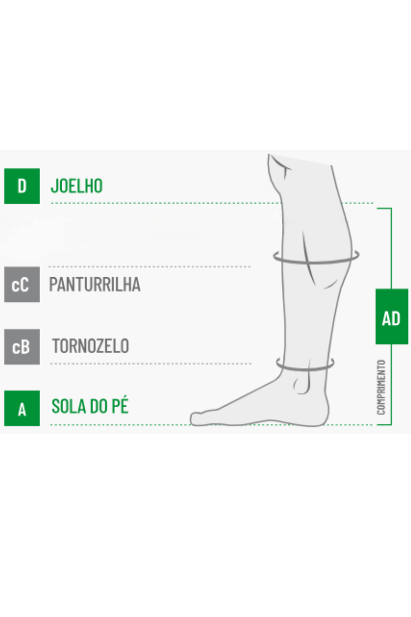 | Tamanho (cm) | Tornozelo (B) | Panturrilha (C) |