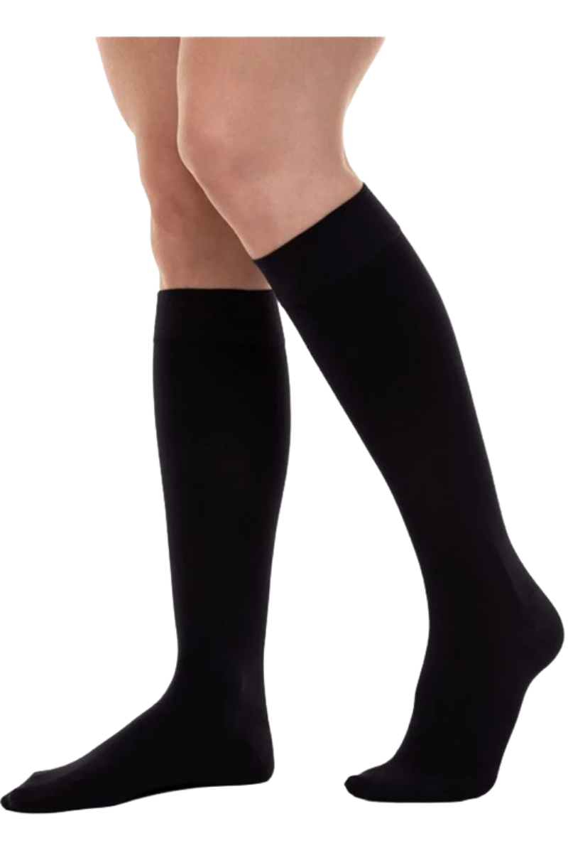 Confeccionada em microfibras Tactel e malha elástica de alto padrão, a meia oferece toque sedoso, boa respirabilidade e ajuste anatômico. Isso garante conforto mesmo durante uso prolongado, sem perder a compressão terapêutica.