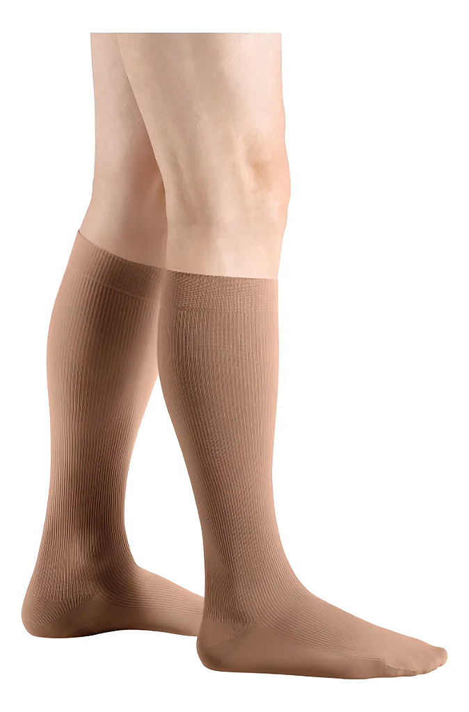 Compressão do tornozelo até abaixo do joelho, facilitando o uso diário.