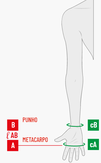 | Tamanho (cm) | Comprimento (BC) | Pulso (C) | Base dos Dedos (G) |